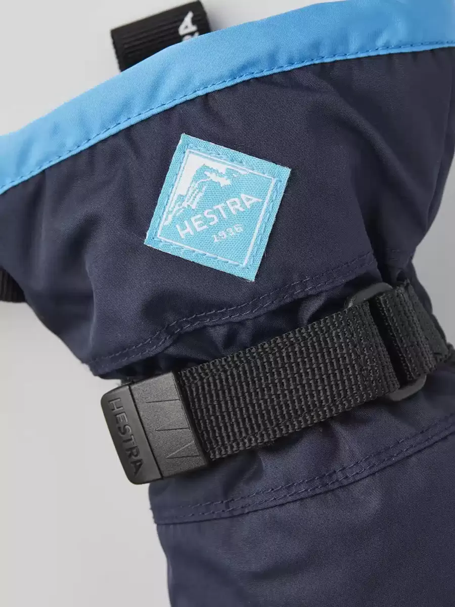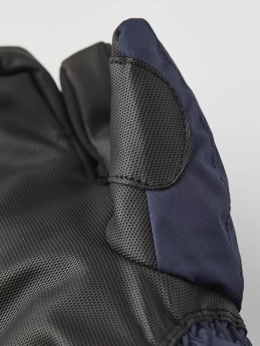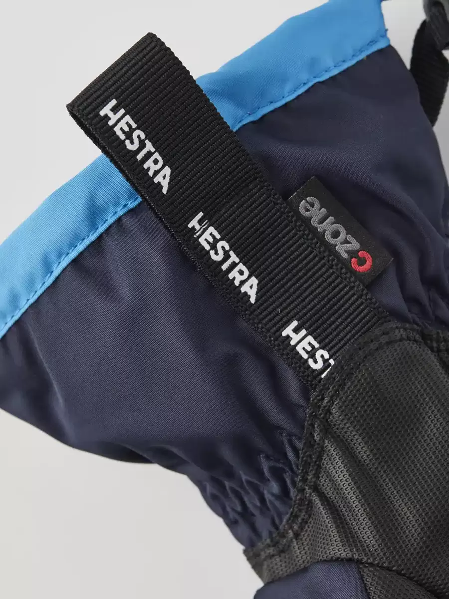 En varm och bekväm junior 3-fingershandske för skidåkning, lek och utomhusaktiviteter i kallt vinterväder. En av Hestras mest populära juniorhandskar, sydda i slitstark polyester med ett vattentätt, andningsbart CZone-membran och en längre mudd för att hålla snön ute. Fingertopparna och handflatan är förstärkta med PU-belagt syntetmaterial för extra styrka och grepp i stavar, pulkor och annan vinterutrustning. Fodret är tillverkat av polyesterfleece med varm syntetisolering. Finns även som vante och i en femfingersversion.