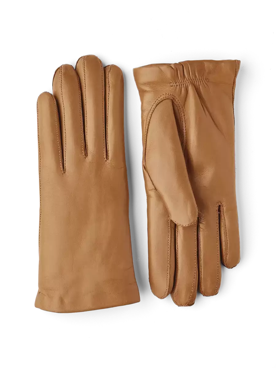 En kort damhandske med en sofistikerad, strömlinjeformad design, sydd i italienskt fårskinn med ett stickat foder i mjukaste kashmir. Handsken är handskuren av handskärare i Hestras verkstad i Ungern och hantverket är mästerligt, med pikésömmar på handryggen och handflatan. Handsken sitter åt åtsittande och fodret i kashmir är härligt värmande under kalla höst- och vinterdagar.