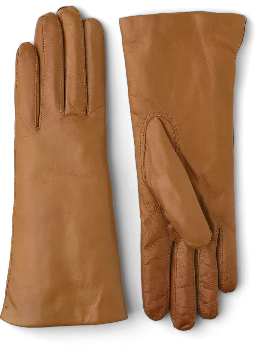 En klassisk damhandske med stickat kashmirfoder för en värmande, mjuk och lyxig känsla. Handsken är handskuren i italienskt fårskinn, ett mjukt, smidigt läder med utmärkt glans, i Hestras verkstad i Ungern. Designen är åtsittande och hantverket utsökt, med pikésömmar på handrygg och handflata.