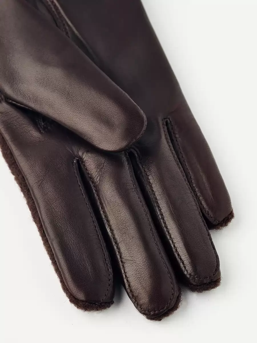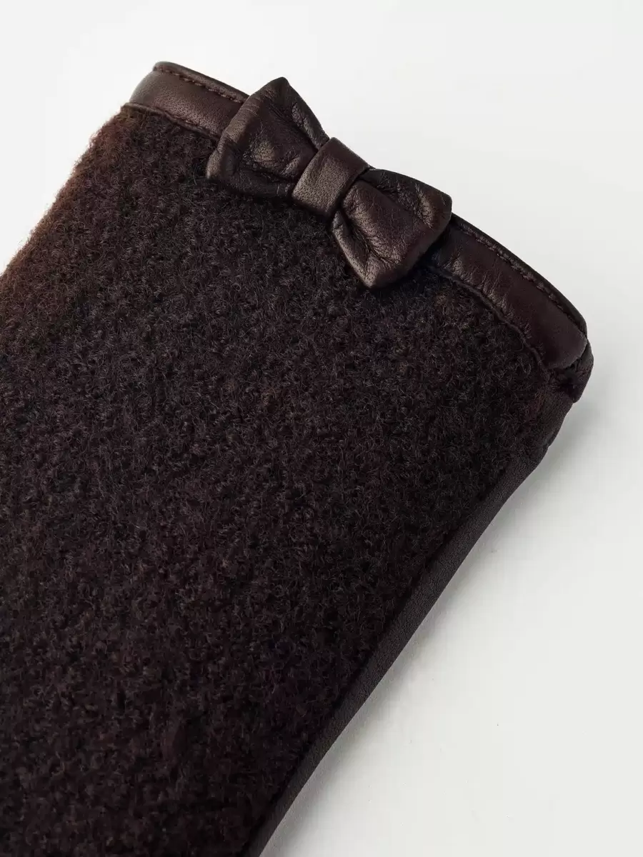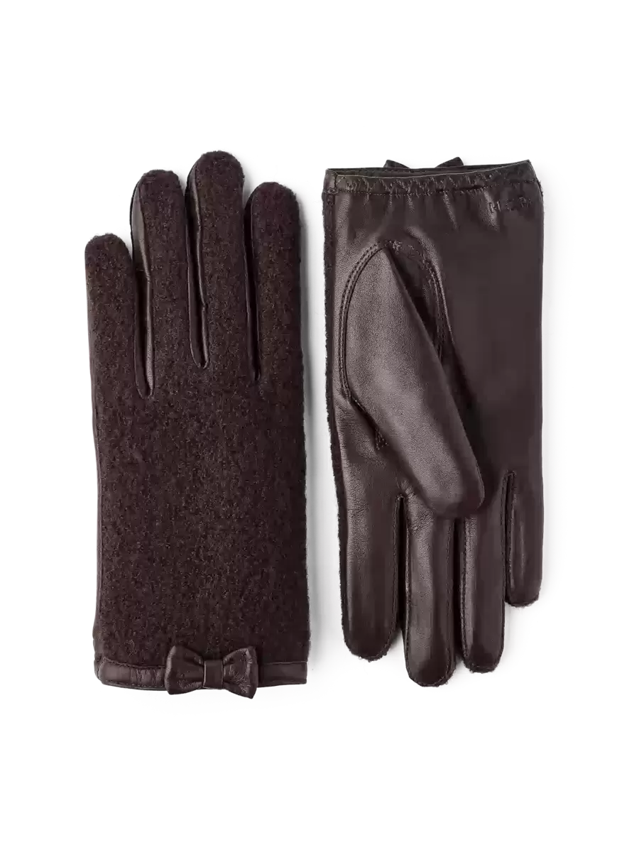 Passformen är nära handen, med ett tunt stickat ull-/polyamidfoder. Fint bearbetade detaljer inkluderar pikésömmar längs fingrarna, läderkanter och en liten rosett på utsidan av handleden. En tidlös modeaccessoar för vardagsbruk och speciella tillfällen.