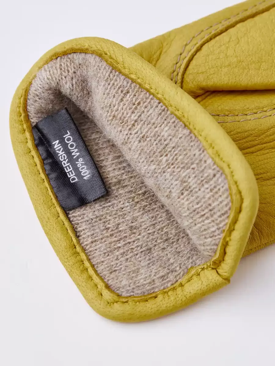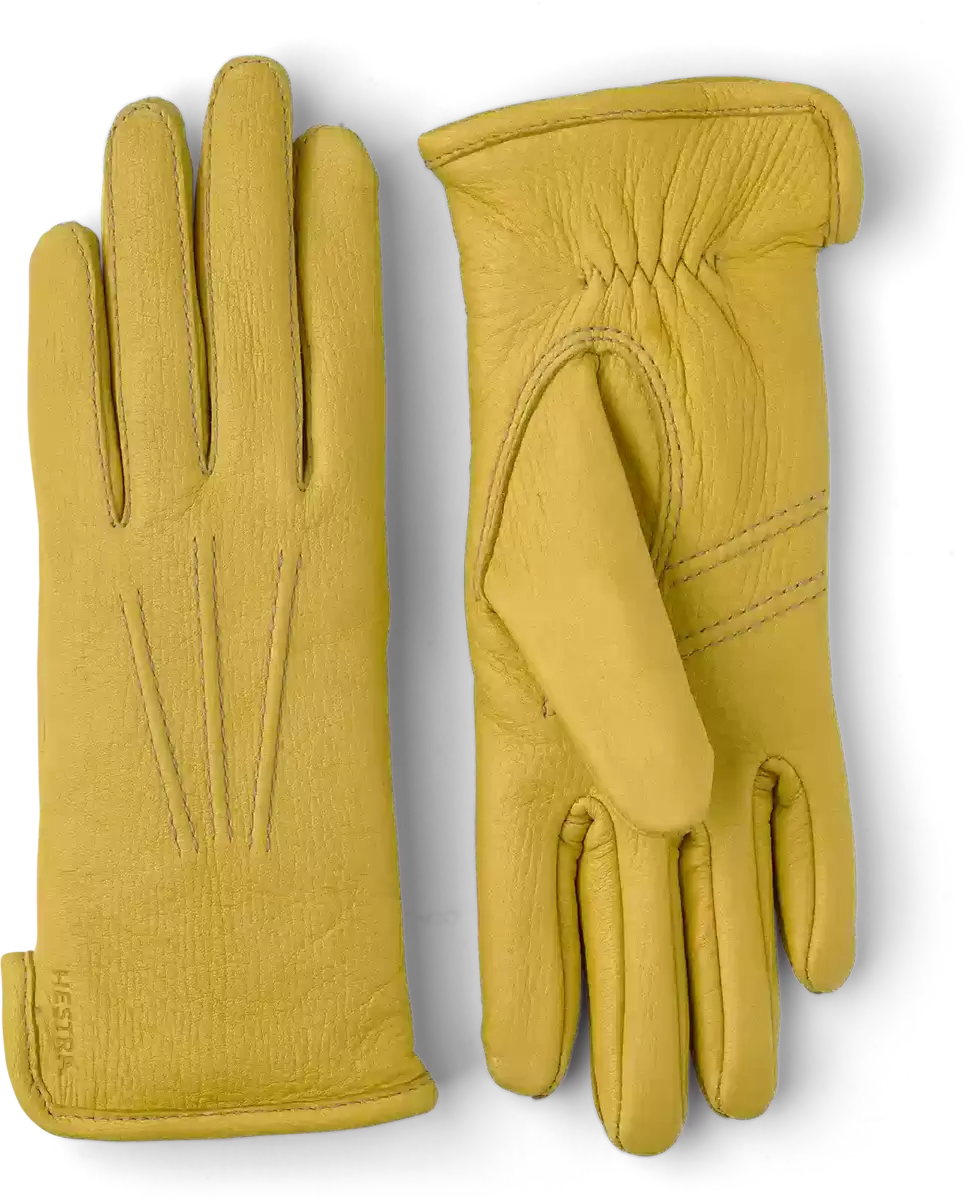 En mjuk och varm damhandske i klassisk stil. En underbar höst- och vinterhandske sydd i hjortskinn, ett smidigt, isolerande läder med vacker ådring. Den har dekorativa sömmar på baksidan av handen medan en slits gör den lättare att ta på. Ett tunt, stickat ullfoder håller händerna varma under kyliga vinterdagar.