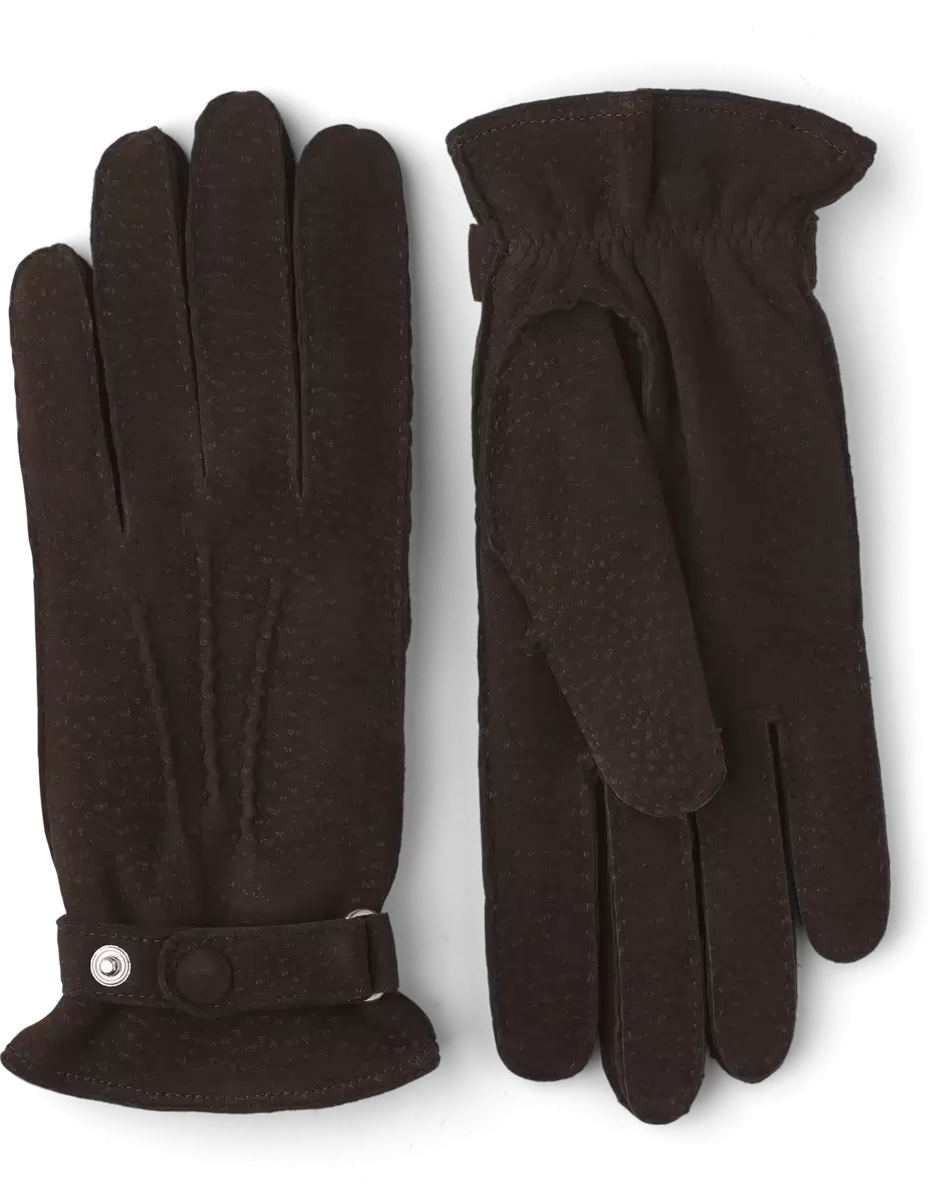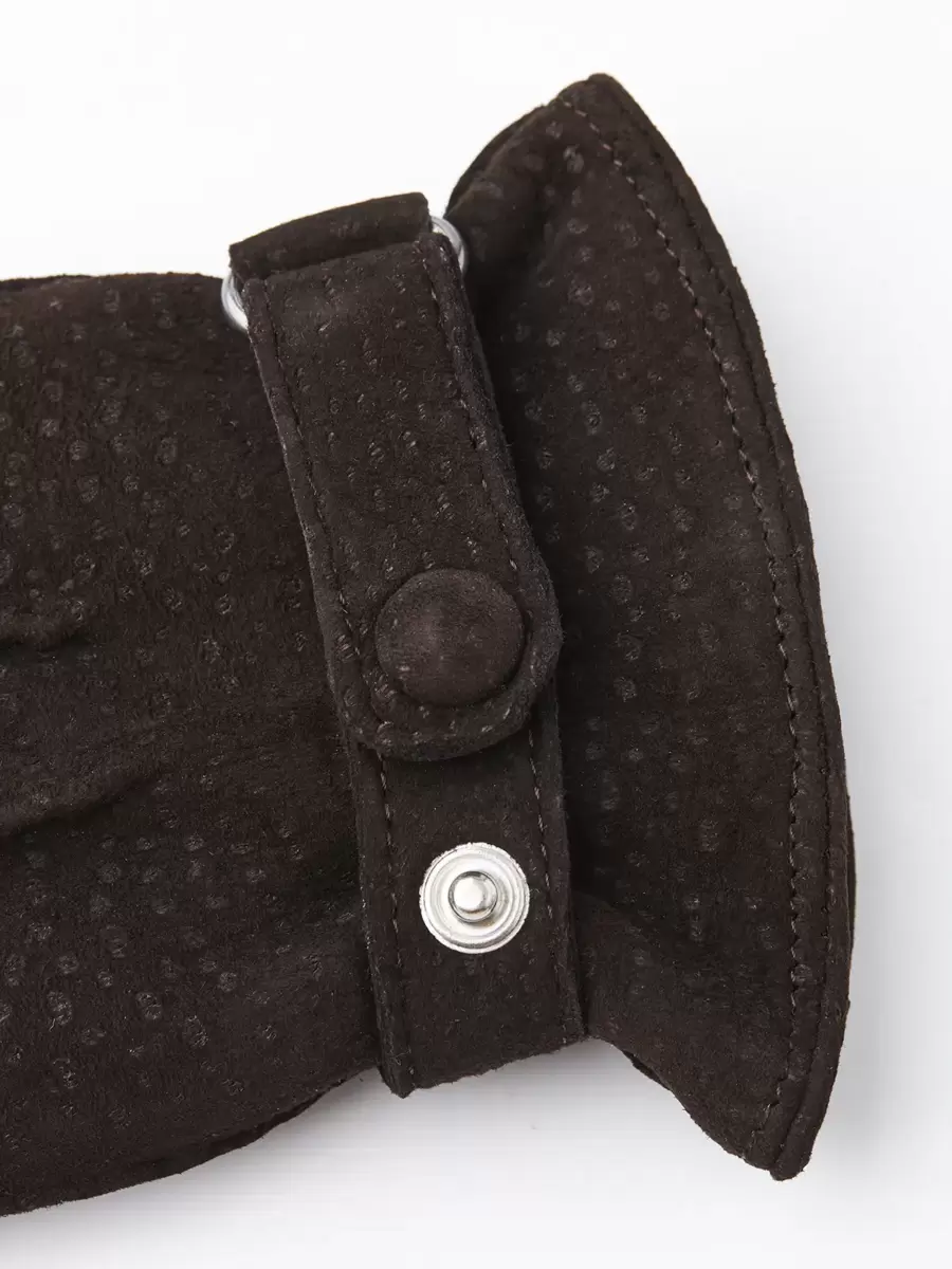 En exklusiv, handsydd handske som kan dras åt runt handleden med en rem. Tillverkad i carpincho nubuckläder, ett mjukt, vackert läder med en omisskännlig ”spräcklig” textur.