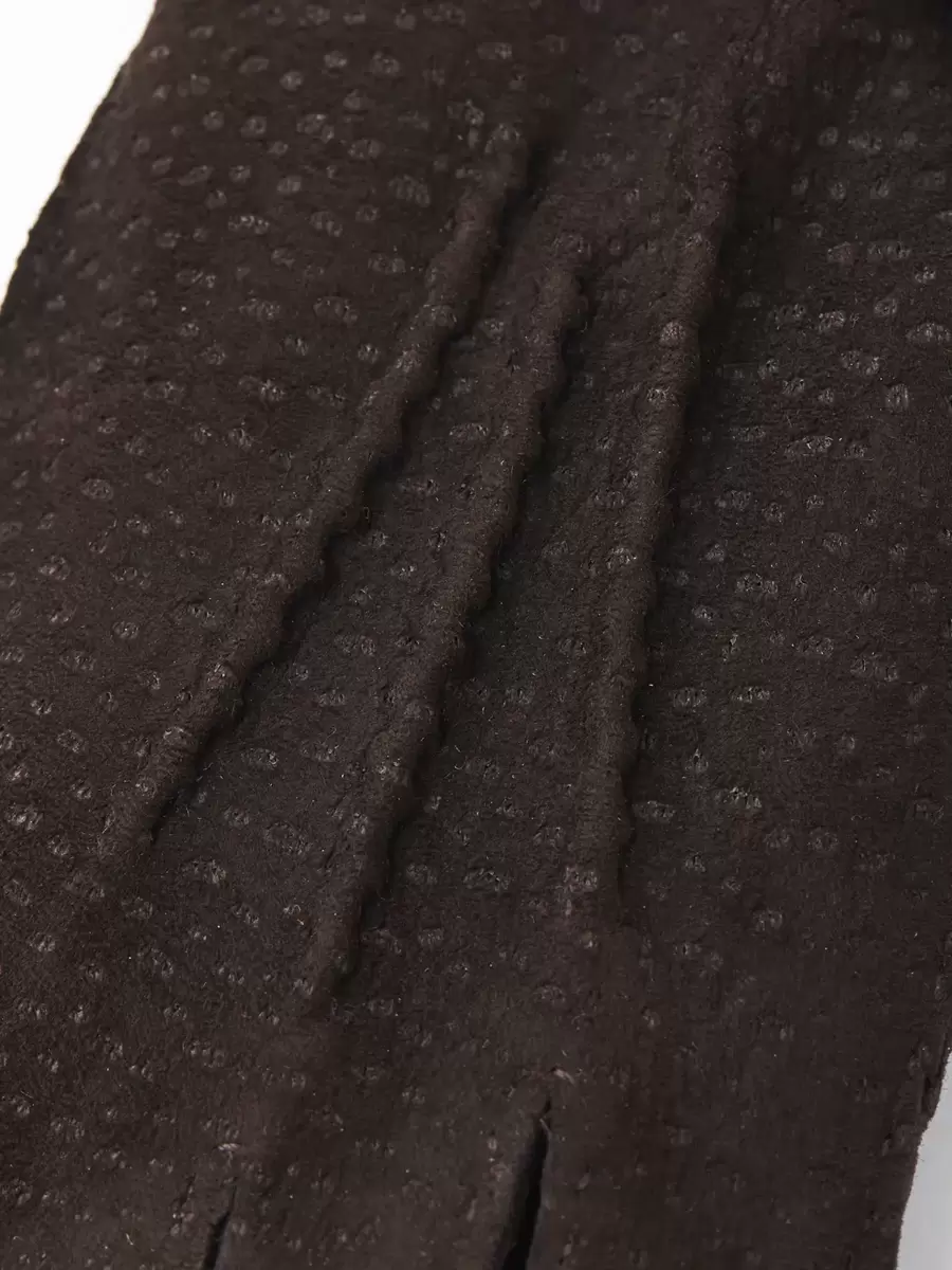 Carpincho, även känd som kapybara, är en gnagare som lever på Sydamerikas slätter. Bland handskskärare ses lädret som ett av de finaste i världen, med liknande egenskaper som peccary. Det är förvånansvärt mjukt att bära, samtidigt som det är starkt och hållbart. Denna handske använder nubuck där den garvade ytan är polerad för att skapa en textur som liknar mocka.