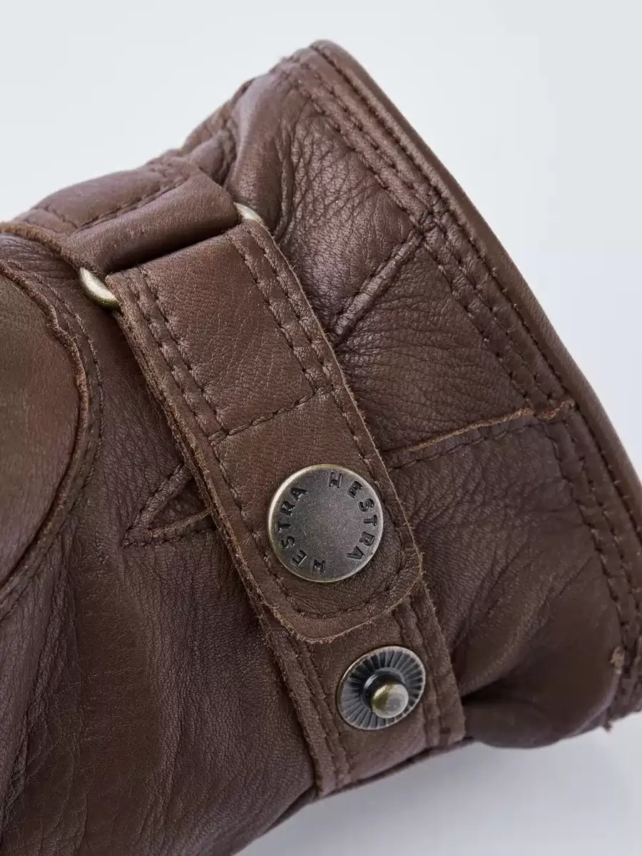 Den klassiska designen har halvpikésömmar på fingrarna och klassiska sömmar på handryggen. En läderrem med tryckknapp justerar vidden runt handleden.