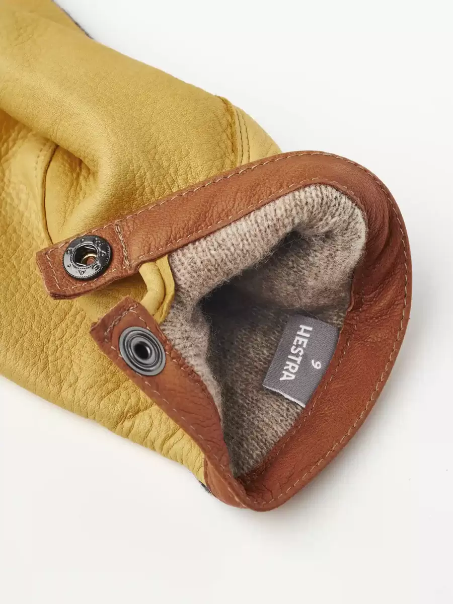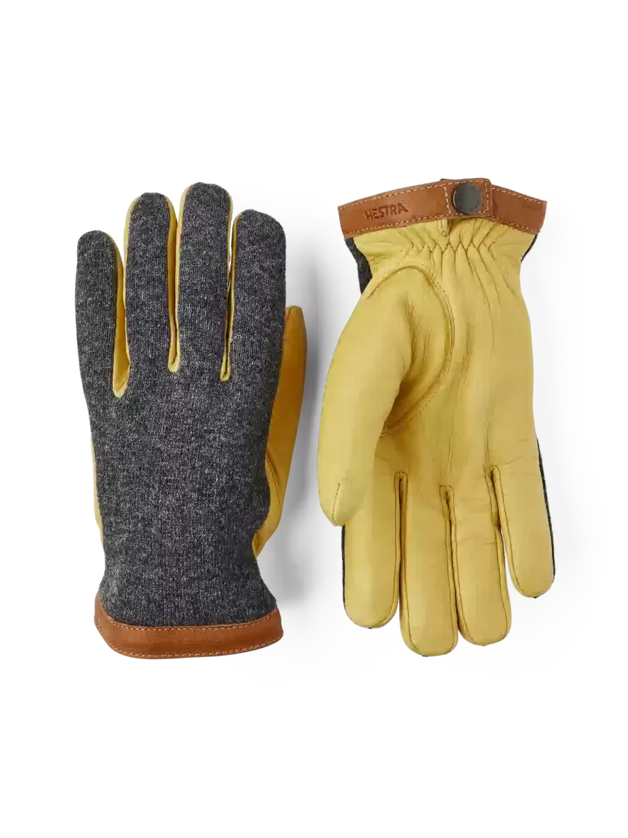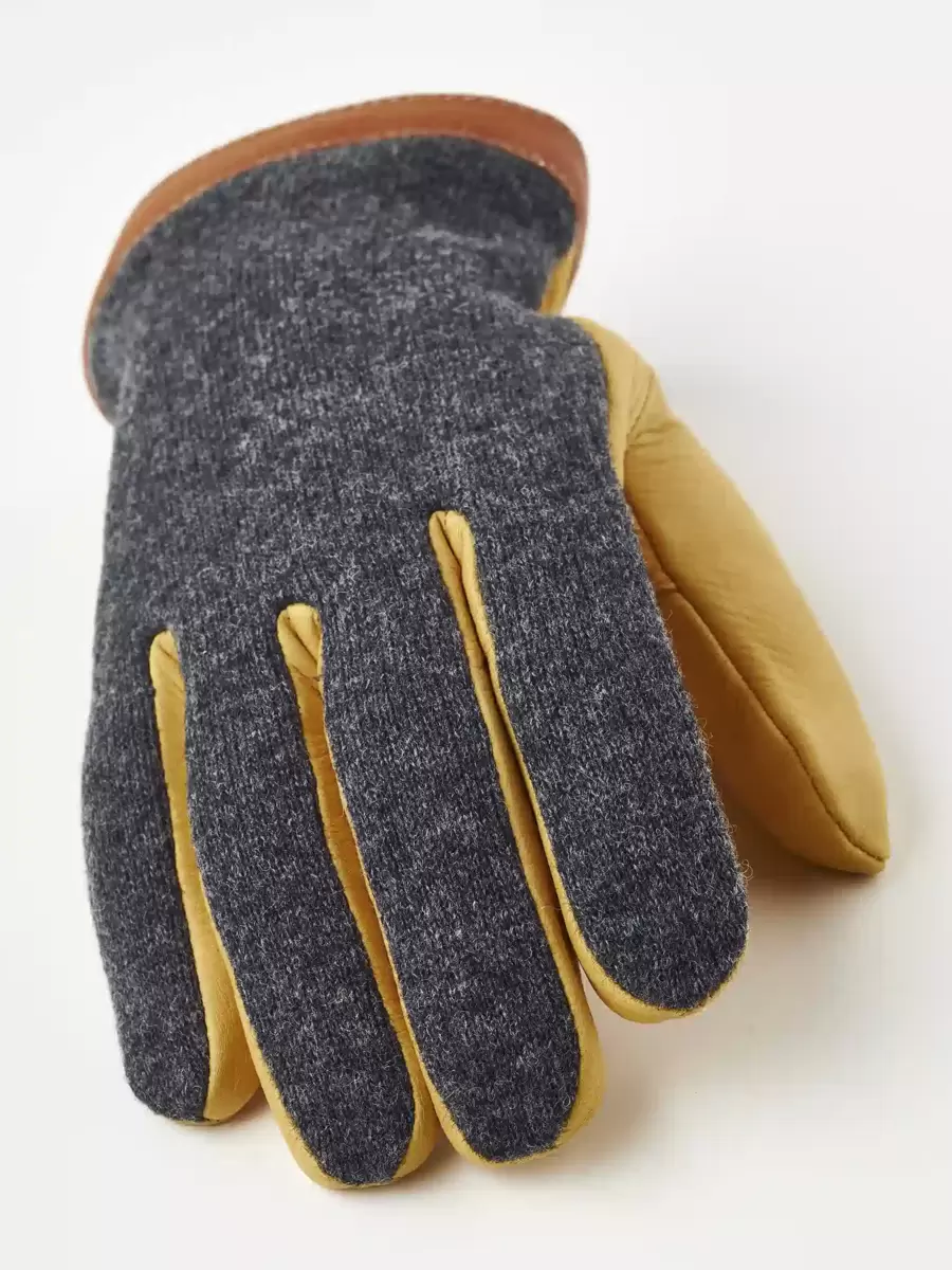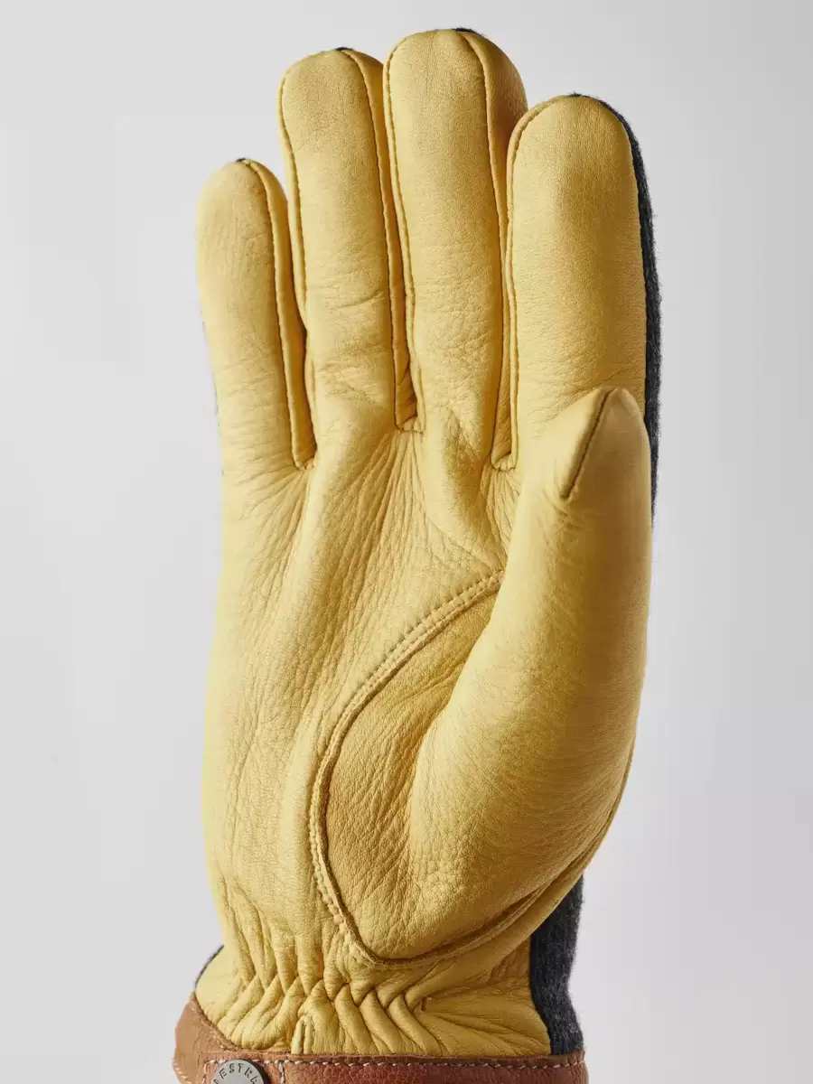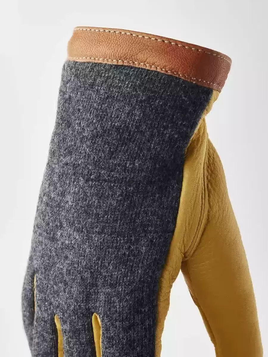 Naturmaterial sätter tonen i denna snygga, minimalistiska herrhandske. Handflatan är i smidigt hjortskinn, ett vackert, värmande läder som skapar en attraktiv kontrast till ulljerseyn på handryggen. I övrigt är designen minimalistisk med en kant av vegetabiliskt garvat getskinn runt manschetten. En elastisk söm på insidan av handleden ger en utmärkt passform och det finns även en tryckknapp på insidan av handleden. Ett tunt, stickat merinoullfoder är mjukt och värmande. Vackra material och väl genomtänkta detaljer skapar en tidlös accessoar som kan bäras för arbete eller fritid och som passar lika bra i urbana som lantliga sammanhang.