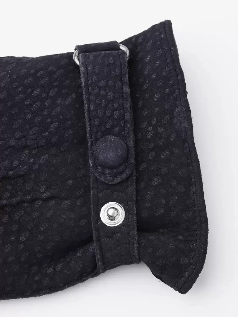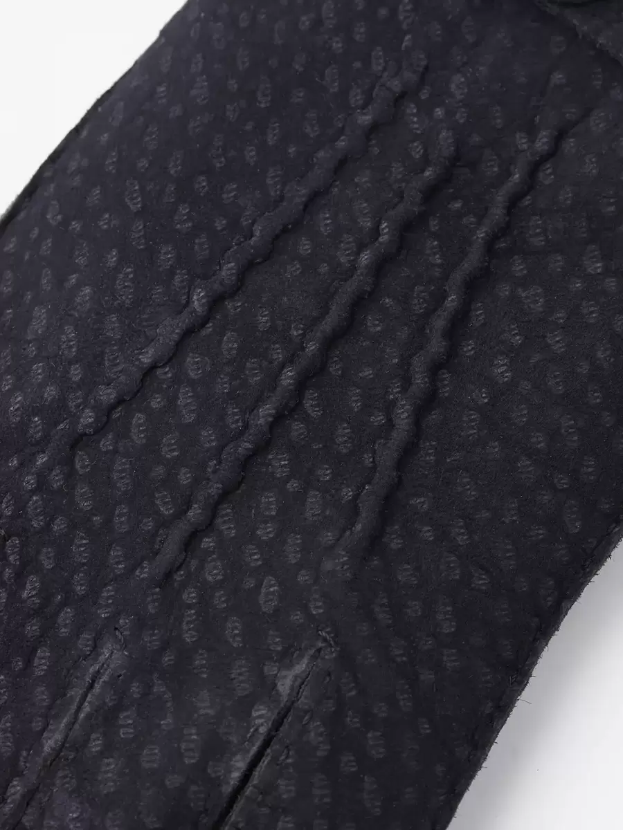 En exklusiv, handsydd handske som kan dras åt runt handleden med en rem. Tillverkad i carpincho nubuckläder, ett mjukt, vackert läder med en omisskännlig ”spräcklig” textur.