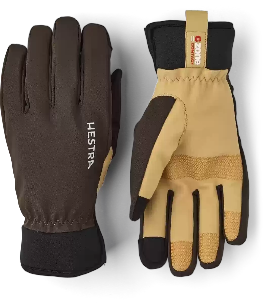 Bra grepp och skydd mot regn och vind – med Hestras CZone Contact Glove behöver dåligt väder inte betyda att man fryser en sommardag i bergen, eller vart dina friluftsplaner än tar dig. Denna smidiga 5-fingershandske är sydd i flexibelt stretchtyg med ett vattentätt och andningsbart membran som håller handen behagligt torr. Handflatan är i slitstark syntetisk mocka med ett greppvänligt tryck och pekskärmskompatibelt material på tummen och pekfingret. Mjuk microfleece inuti och en neoprenmanschett som bekvämt omsluter handleden. En praktisk och mångsidig följeslagare vid promenader, cykling, fiske och på alla typer av äventyr i det fria under vår, sommar och höst. * Färg 370 har reflekterande tyg på handryggen.