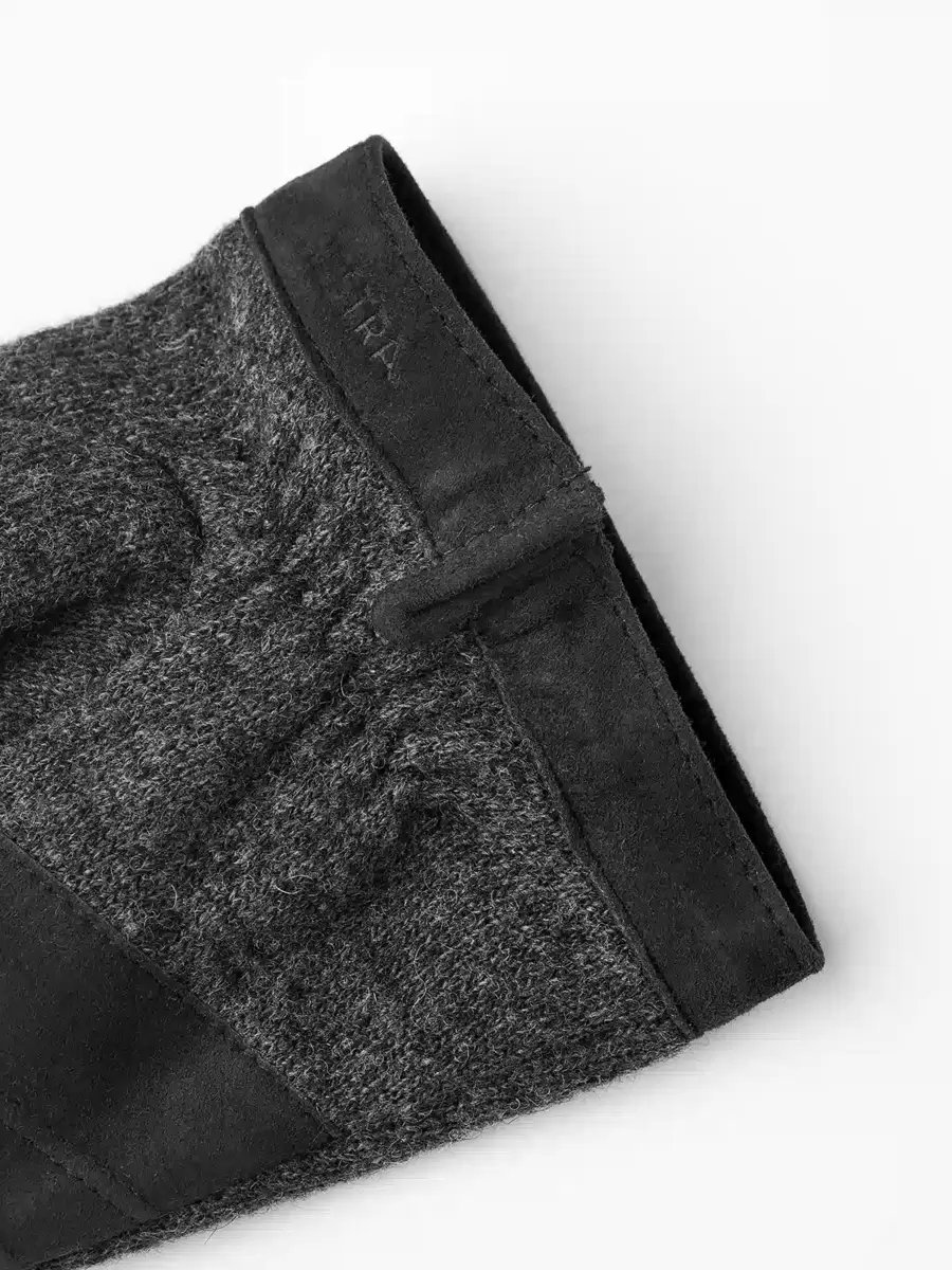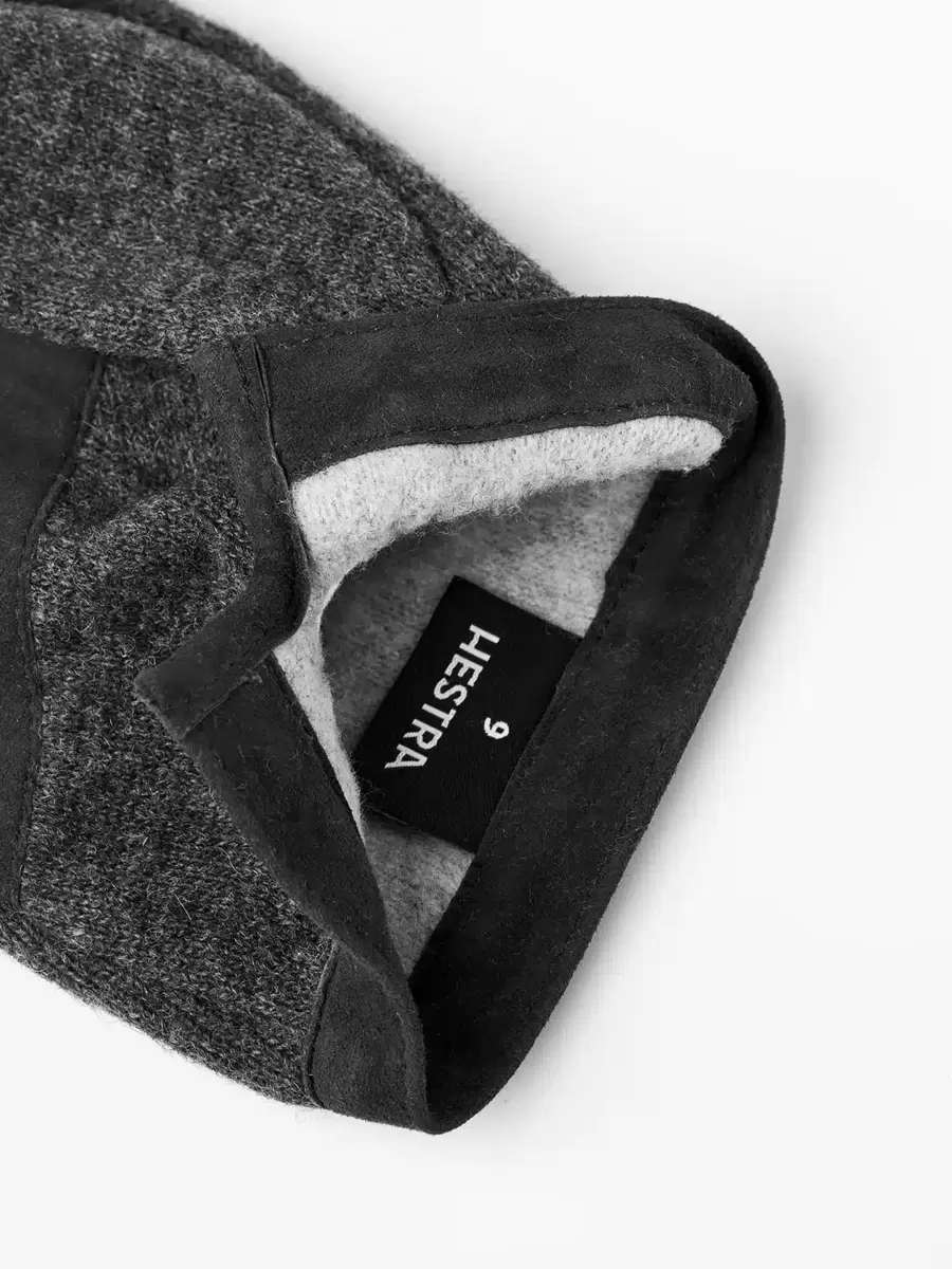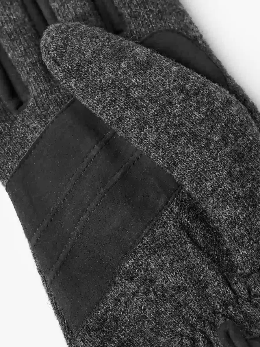En snygg handske i ulljersey och smidig fårmocka. En lätt, smidig herrhandske med tidlös stil och vackert utförda detaljer. Mockaförstärkning för extra grepp i handflatan och mellan fingrarna, och lädret runt handleden kontrasterar fint mot det stickade materialet. Denna handske är ofodrad, men insidan är borstad för lätt värme under kyliga höstdagar.