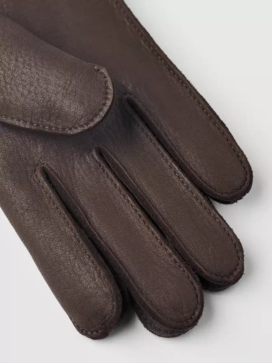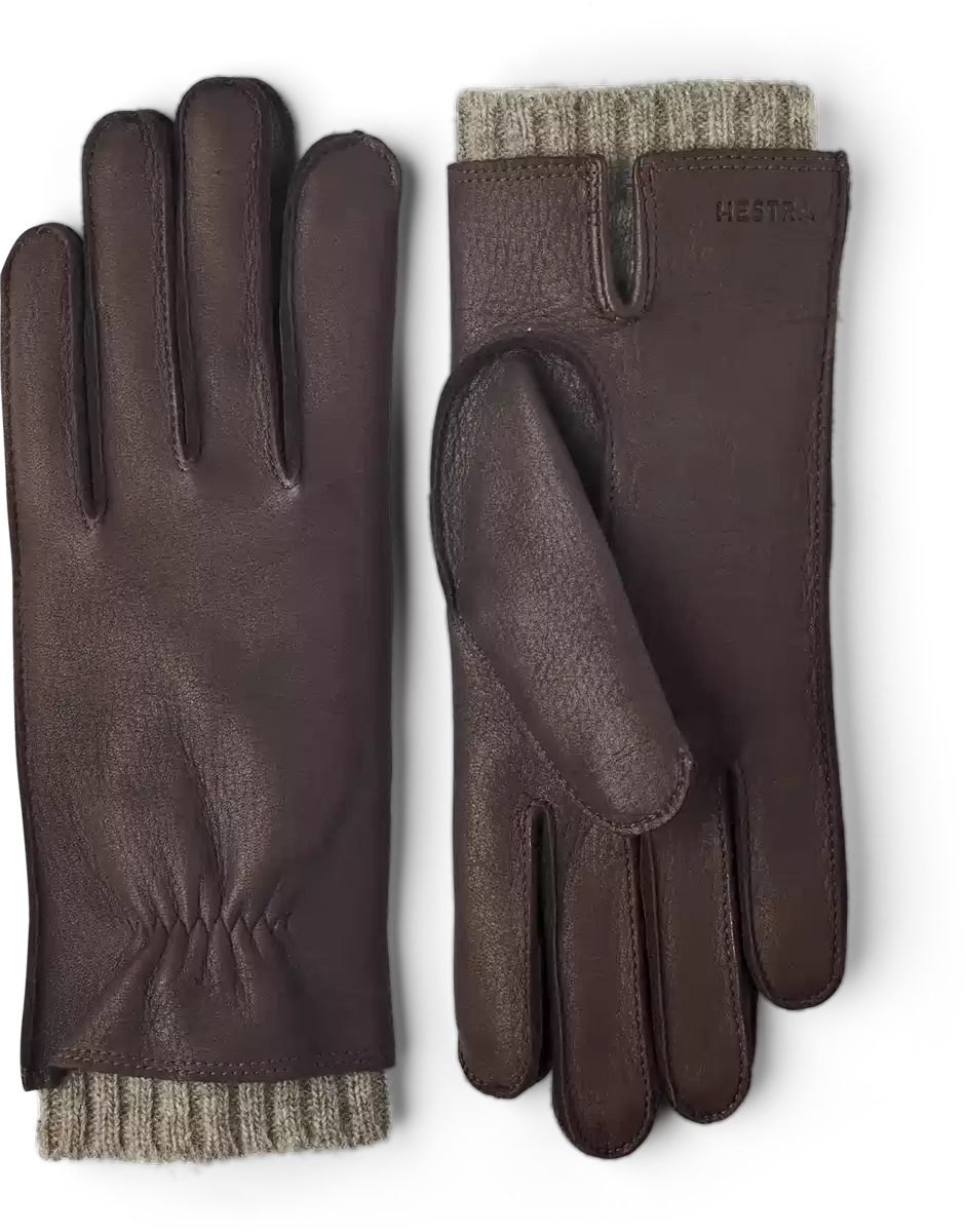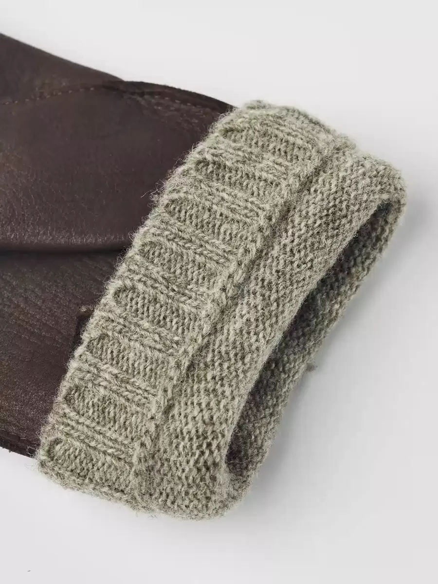 Handsken är sydd i hjortskinn, ett mjukt och smidigt läder med bra isolering. Passformen är nära handen, med en elastisk söm på utsidan av handleden och en liten slits på insidan av handleden. Ett stickat ullfoder ger behaglig värme under kyliga vinterdagar och fungerar som en kort ribbad mudd – en attraktiv detalj på en vacker, värmande handske.