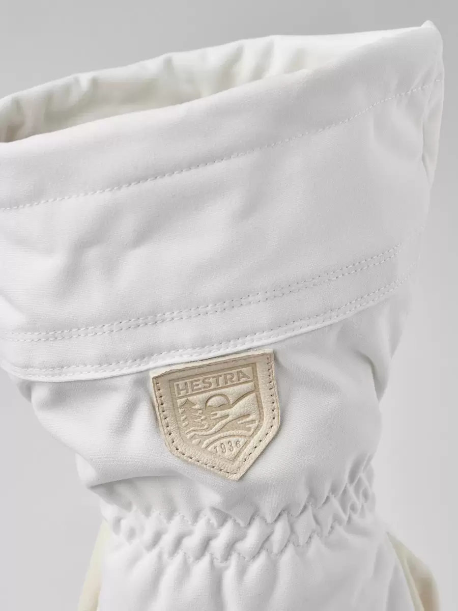 Baksidan är sydd i Hestras slitstarka 3-lagers polyamidväv, nu tillverkad av återvunnet material. Getskinnet på handflatan är kromfritt och ofärgat, och precis som tidigare behandlat för slitstarka egenskaper och varaktigt väderskydd. Dragskoklämman och andra plastdetaljer är tillverkade av återvunnen nylon medan det avtagbara fodret är i värmande ullfrotté, med ullfleece på baksidan för extra isolering.