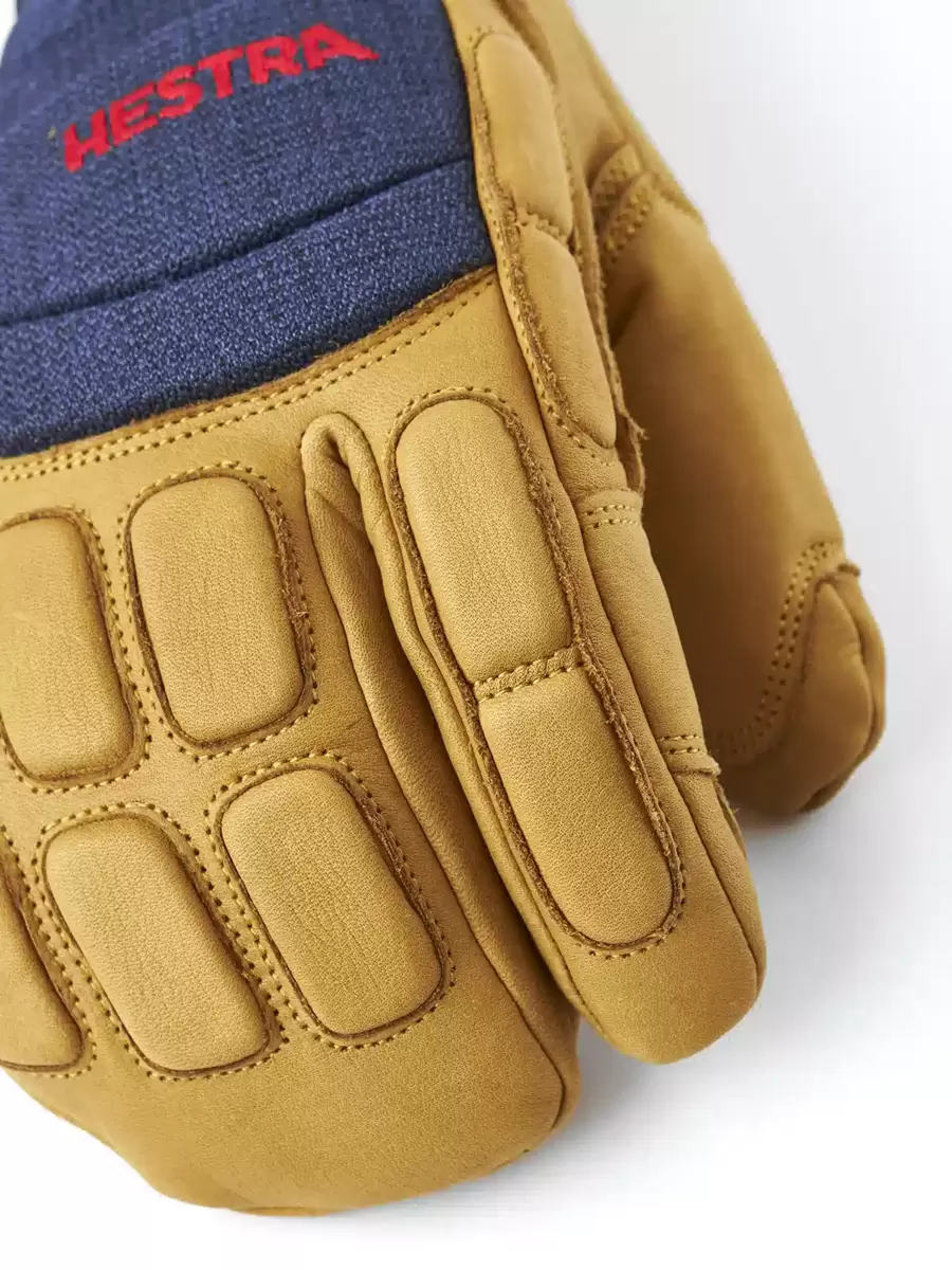 Hestras Vertical Cut CZone är en praktisk 3-finger skidhandske för freeriding och snowboard. Tillverkad av slitstark getnappa* med förstärkningar på utsatta delar. Ett CZone-membran skyddar mot vatten och släpper ut fukt, medan G-Loft syntetfyllning isolerar under de långa vinterdagarna på berget. Handsken har yttersömmar för bättre komfort och stavgrepp. Skumpaneler på handens ovansida skyddar mot fall och stötar. En neoprenmanschett ger bättre passform och håller värmen inuti handsken, samtidigt som den kan glida smidigt inuti jackärmen. Andra smarta detaljer inkluderar handledsremmen som minskar risken för att du tappar handsken, och en karbinhake för att fästa den i din ryggsäck. 3-fingermodellen är för dig som letar efter en varmare handske samtidigt som den bibehåller fingerfärdigheten. Finns även i 5-fingermodell. * färgerna 280701 och 870701 är tillverkade av kohud.