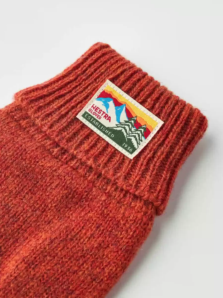 Klassisk slätstickad handske i mjukt ullmelangegarn. En mångsidig, lättanvänd vardagshandske för höst och mildare vinterdagar, och lätt att stoppa i fickan när den inte används. Dubbel ribbad mudd med en vävd Hestra-logotyp på utsidan av handleden och ett tunt stickat ull-/polyamidfoder som ger extra värme runt fingrarna.